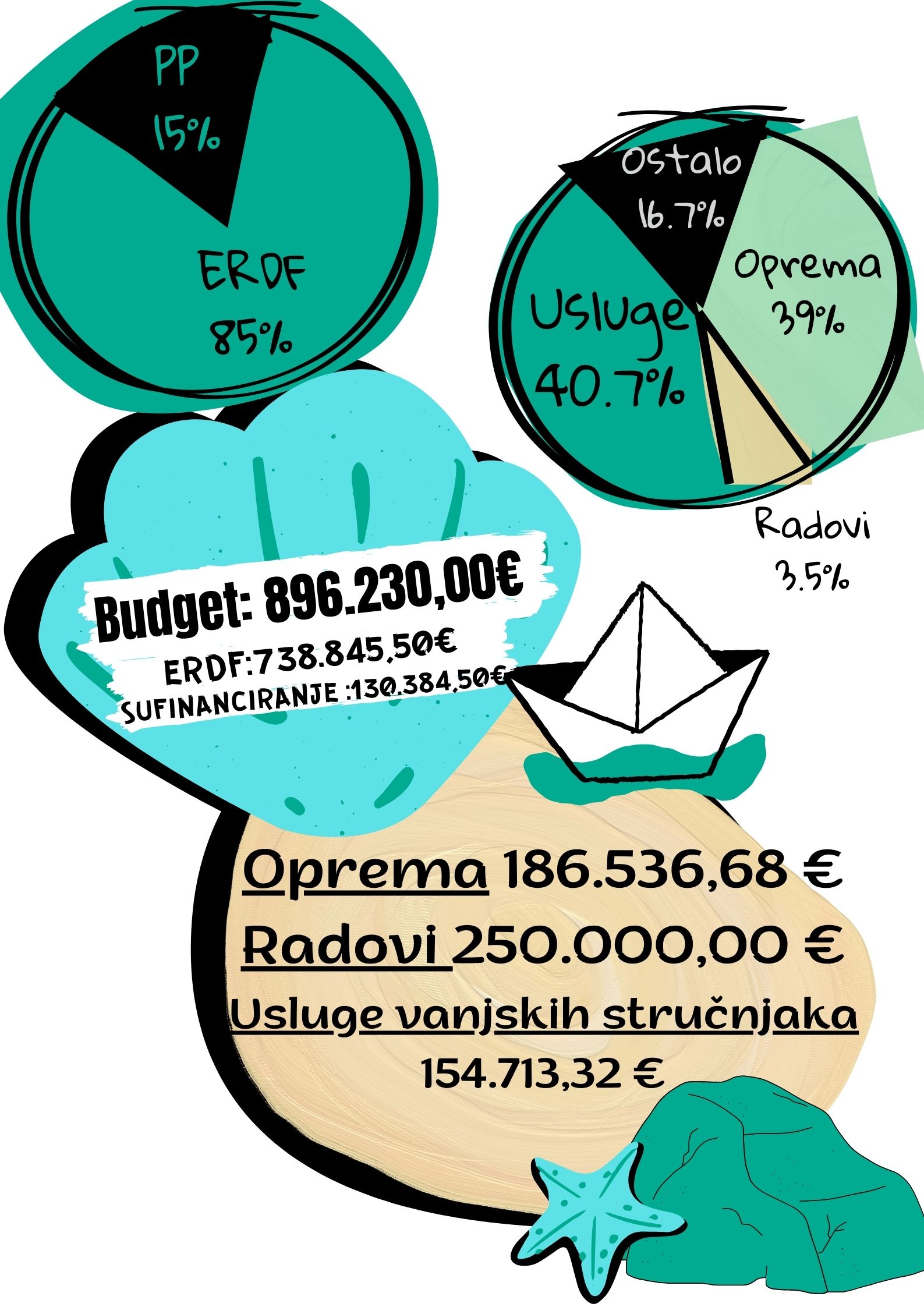 1. Ukupna proračunska sredstva za projekt iznose 3,749,696.92 €. Od tih sredstava Europski fond za regionalni razvoj financira 3.199.991,33 €, a partneri sufinanciraju 564.704,38 €. Proračun za Dubrovačko-neretvansku županiju iznosi 863,213.81 €, odnosno 738.845,50 € financira Europski fond za regionalni razvoj, a nositelj projekta 130.384,50 €.